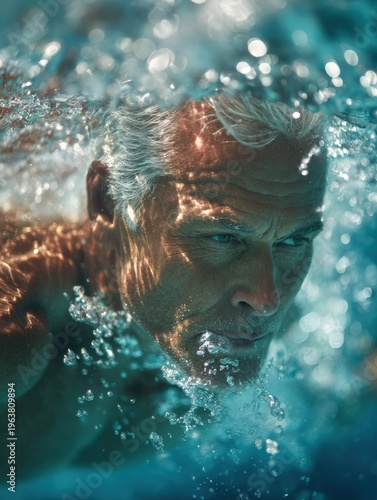 Silver-haired Man Swims in a Pool, Creating Splashes and Reflections, Showcasing Active Senior Lifestyle and Fitness Engagement