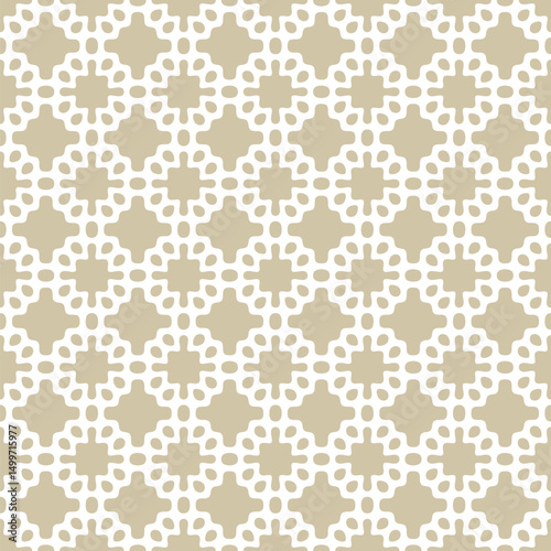 Simple abstract seamless ornament. Golden geometric pattern with dots, spots, curved shapes, grid. Gold and white background texture. Repeating all-over geo design for decor, textile, wallpaper, print