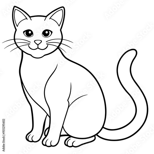 Simple and cute line art drawing of a happy cat sitting with its tail curled around