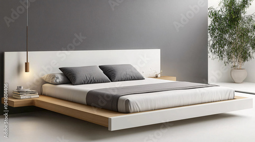 bedchamber, simple, design, white, bed, grey, pillow, floating, wooden, shelf, nightstand, decor, modern, cosy, clean, aesthetic, home, inviting, minimalist, stylish, arrangement, atmosphere, fresh, calmness, comfort, elegant, warmth, functional, space