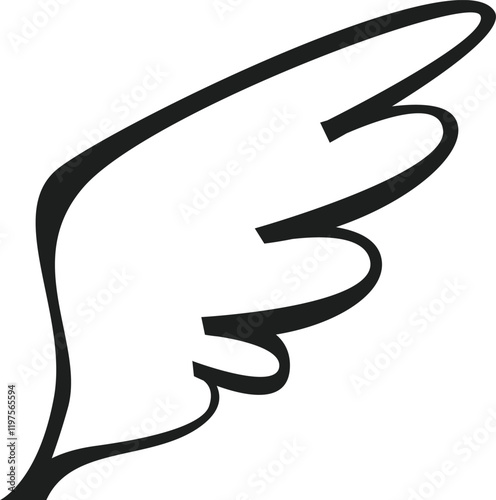 Simple black and white drawing of a stylized bird wing rising up, representing freedom, travel, and spirituality, perfect for logos and illustrations