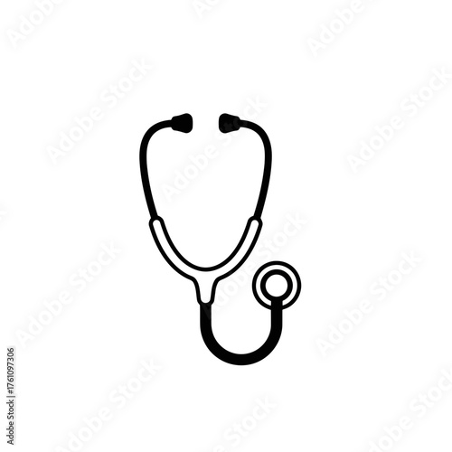 stethoscope, medicals, health, doctor, health care, icon, symbol, illustration, clip art, medicine, diagnosis, care, hospital, clinic, nurse, physician, equipment, tool, listen, heartbeat, lung, body, wellness, check-up, exam, white, background, black, and, simple, minimalist, graphic, design, vector, flat