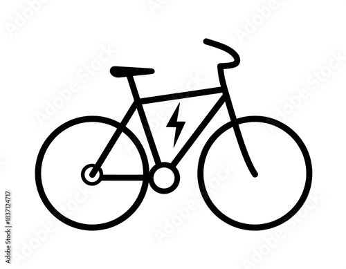Simple black and white illustration of an electric bicycle, featuring a lightning bolt