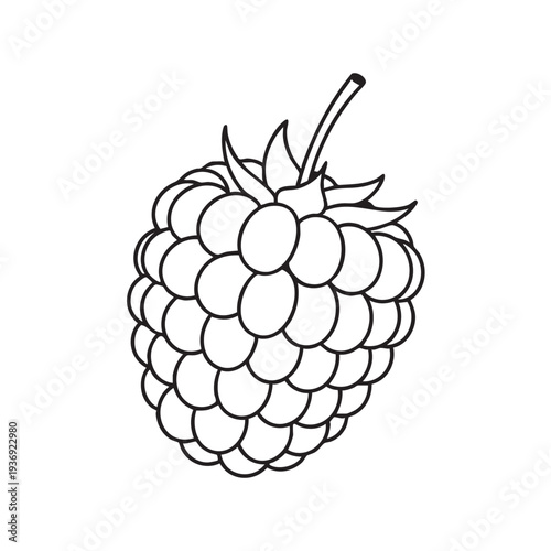 Simple black and white outline drawing of a single raspberry with stem and sepals on white background, healthy juicy organic berry illustration