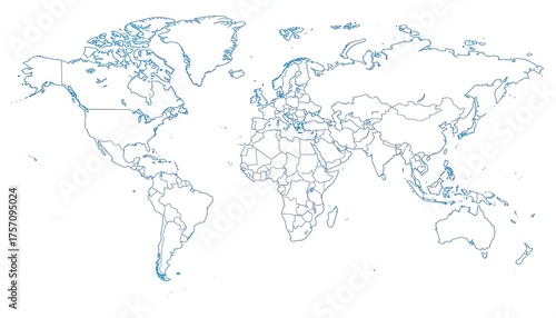 Simple blue outlined world map highlighting all the countries and continents