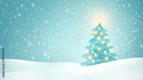 Simple Christmas tree in a snowy landscape with snowflakes falling, glowing star on top. Peaceful winter holiday or festive greeting card concept.