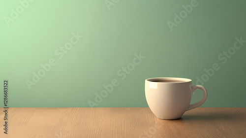 Simple Coffee Break: A minimalistic shot of a coffee cup placed on a wooden table with a vibrant green wall, capturing a sense of simplicity and tranquility.