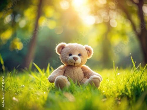 Simple, cute plush teddy bear photography: minimal setting, vibrant grass backdrop.