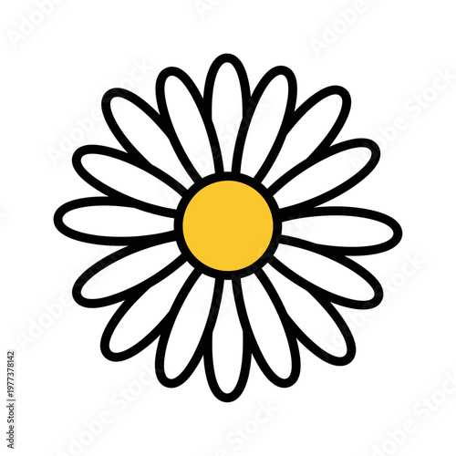 Simple Daisy Flower Icon, White Petals, Yellow Center, Black Outline, Isolated Graphic