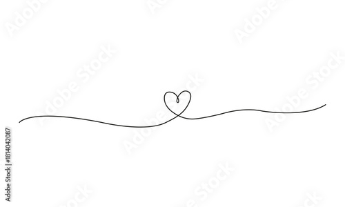 Simple, delicate, handdrawn style continuous line divider featuring a small heart shape in the center, isolated on white background