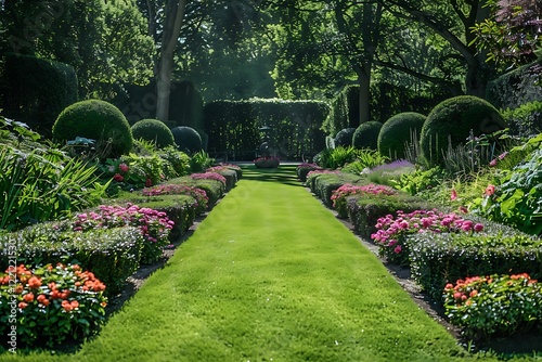 Simple garden featuring a clean, rectangular lawn bordered by orderly flower beds and neatly spaced shrubs.