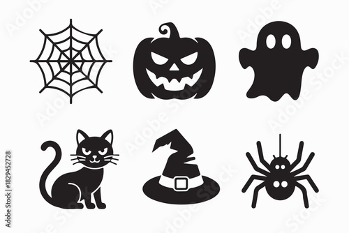 halloween, icon, set, black cat, spider, spider's web, ghost, skittish, silhouette, graphic design, vector, illustration, clip art, printable, black-and-white, holiday, autumn, fall, scarey, monster, fright, children, graphic elements, simple icons
