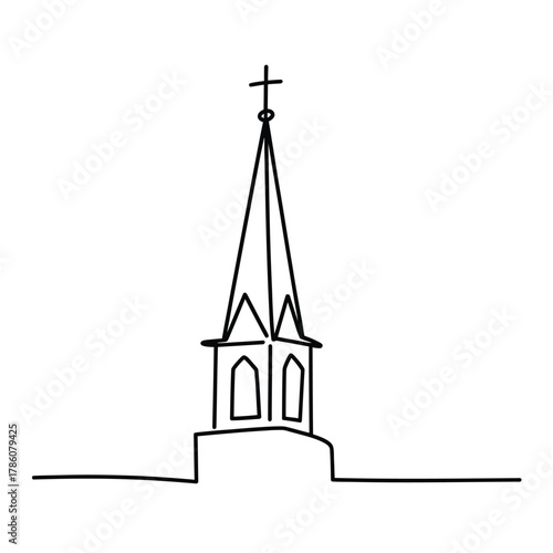 church, church steeple, cross, architecture, building, religious, christian, faith, worship, sacred, icon, symbol, outline, vignetting, drawing, hand, drawn, minimalist, simple, clean, isolated, white, background, line, art, vector, design, illustration, traditional, historic