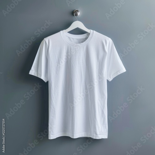 Simple hanging white t-shirt, made from pure cotton, with short sleeves and grey backdrop