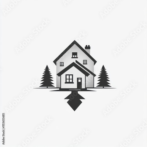 house, home, real, estate, property, building, architecture, residential, dwelling, bungalow, chalet, cabin, tree, nature, landscape, design, icon, symbol, logotype, graphic, illustration, vector, image, simple, minimalist, modern, clean, elegant, grey, monochrome, shadow, silhouette, evergreen, pine, forest, rural, suburban, family, comfort, shelter, security, peaceful, tranquil, location, landmark, address, plot, land