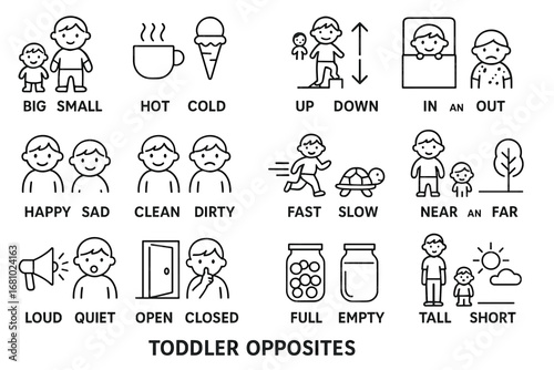 toddler, opposite, big, small, hot, cold, up, down, happy, sad, clean, dirty, fast, slow, near, far, loud, quiet, open, closed, full, empty, tall, short, illustration, icon, children, teaching, education, learning, concept, visual, basic, vector, icon