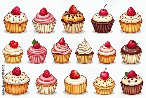 Simple line drawing of various cakes, cupcakes, and pastries , dessert shop, confectionery