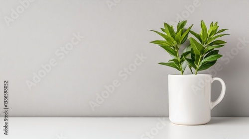 Simple, minimalist plant in a white mug on a shelf against a gray wall