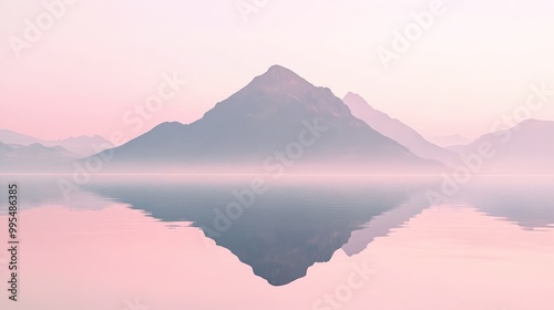 Simple mountain silhouette reflected in calm water, with soft pastel tones and a minimalist aesthetic, creating a tranquil visual