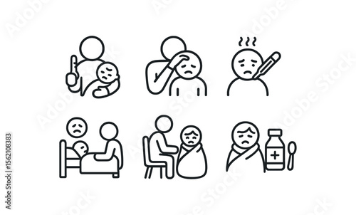vector, icon, illustration, sick, children, icon, fever, bed, medicine, consultation, simple, medicals, care, symptom, pediatric, health, doctor, treatment, cold, flu, unwell, pictogram, health care, graphic, design