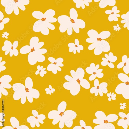 Simple vintage pattern. white flowers on a yellow background. Fashionable print for textiles and wallpaper.