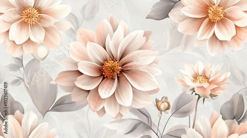 Simple watercolor dahlias with minimal details, soft pastel colors on a light gray background, seamless pattern