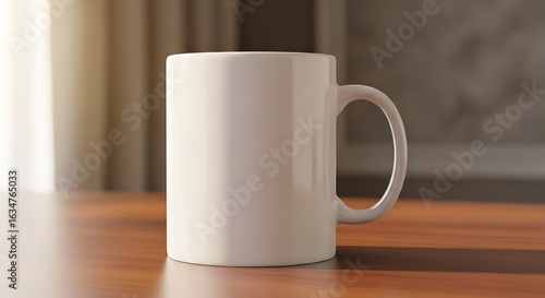mug, white, ceramic, hot drink, tea, cup, beverage, tableware, table, wooden, wood, surface, shadow, light, simple, blank, empty, clean, minimalist, template, design, presentation, still life, indoor, neutral, calm, peaceful, relaxation, morning, sunlight, domestic, household, kitchen utensile, home, interior, render, three-dimensional, illustration, modern, contemporary, plain, single, studio shot, closeup