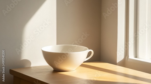 Simple white ceramic teacup with a delicate handle rests peacefully upon a sunlit wooden surface next to a bright window.