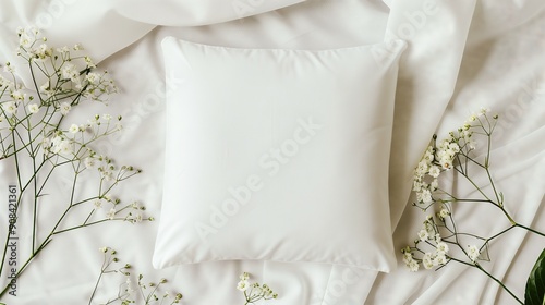 Simple white square cushion, spring atmosphere, spring flowers