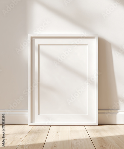 Simple White Vertical Frame Mockup Leaning on Wall with Sunlight Shadow 햇빛 그림자가 드리워진 벽에 기대어 세워진 단순한 흰색 수직 액자 목업