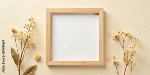 Simple wooden frame with delicate dried flowers on a neutral background, perfect for minimalist aesthetic designs and creative projects