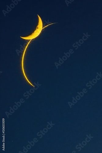 Simple yellow crescent moon on dark blue background, art, stars