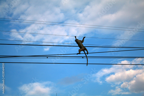 monkey, macaque, siam, lopburi, acrobat, amazing, animal, electric, string, weird, weird, nature, line, cable, travel, tour tourism, cloud