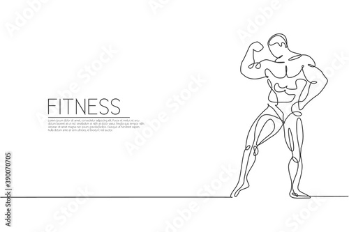 Single continuous line drawing of young muscular model man bodybuilder posing elegant. Fitness center gym logo. Trendy one line draw design vector illustration for bodybuilding icon symbol template
