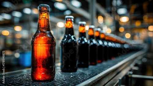 Single glowing amber beer bottle in focus on blurred industrial production line background