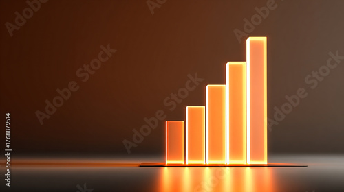 single glowing graph bar rising from a polished reflective surface against a bright minimal background. The scene symbolizes business growth, success, financial progress, innovation, and upward moment