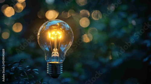 Single glowing light bulb outdoors with bokeh background representing ideas innovation and imagination concept