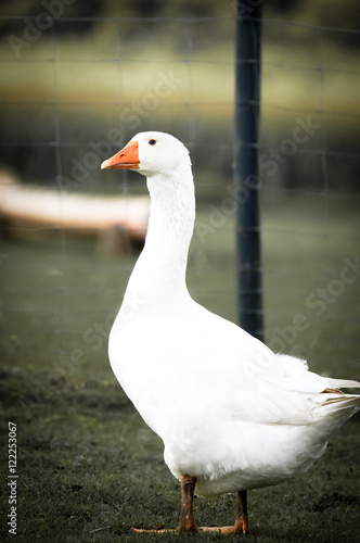 goose, goose, an, 1, look, view, fence, enclosure, vignette, neck, beak, farm, outside, meadow, meadow, eat, sunshine, white, fowl