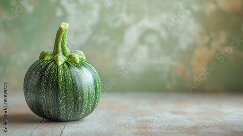 Single green squash on wood with blurred green background.
