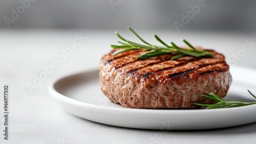 Single grilled burger patty with grill marks on white plate with rosemary.