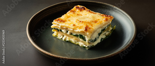 Single lasagna portion on a ceramic plate, artistic food styling with soft natural lighting