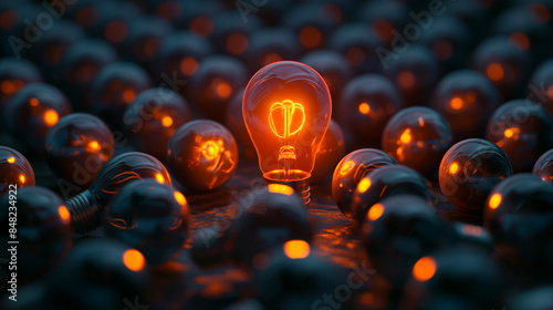 light bulb, glowing, dark, innovation, individuality, many, unlit, standout, concept, idea, illumination, uniqueness, electricity, creativity, contrast, bulb, symbol, bright, invention, thinks, energy, darkness, electric, shine, unique, lighting, multiple, metaphor, individual, light, black, surrounded, glow, creative, night, bokeh, blur, celebration, round, light, abstract, red, yellow, three-dimensional, ball, decoration, christmas, colours, shiny