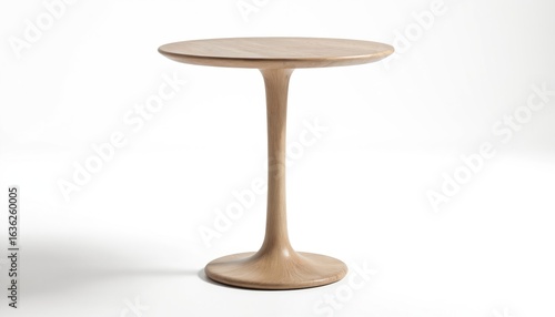 Single modern wooden table with round top and pedestal base. Contemporary furniture design, suitable for cafes, dining rooms or modern homes. Elegant light brown wood object.