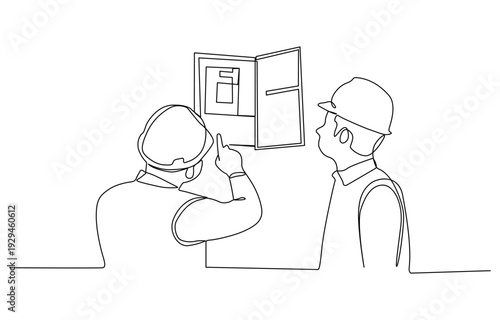 Single one line drawing of two technicians are repairing damage to the electrical unit. Home repair, maintenance and plumbing services. Handyman concept. Continuous line draw design vector illustratio