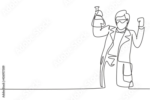 Single one line drawing scientist with celebrate gesture and holding measuring tube to examining chemical solution to make vaccine. Modern continuous line draw design graphic vector illustration