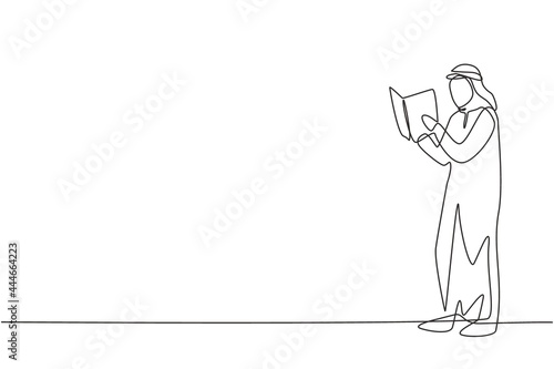 Single one line drawing young Arabian man reading, learning and standing in library. Study alone. Intelligent student, education concept. Modern continuous line draw design graphic vector illustration