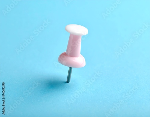 pink, drawing pin, pin, white, blue, background, office, supply, stationery, object, closeup, detail, single, colours, simple, pastel, geometric, shape, round, small, metal, sharp, point, shallow, sharpened, light, bright, surface, flat, image, studio, still, life, photograph, minimalist, design, art, pop, pinkish, isolated