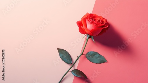 single red rose lies elegantly on two toned background, creating minimalist and striking visual contrast