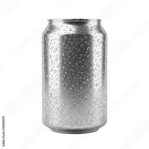 can, beverage, aluminium, condensation, droplet, water, metal, shiny, surface, upright, silver, reflective, cool, drink, container, soda, pop, fizzy, refreshing, summer, dew, moisture