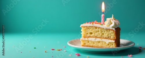 Single slice of birthday cake with burning candle on teal backdrop, delicious, bakery, celebration